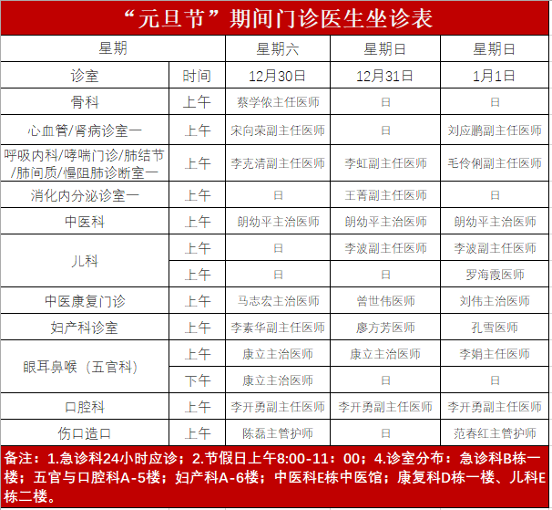 01、2023年12月30日~2024年1月1日8:00~11:00(周六~周一),門(mén)診內(nèi)科、口腔與耳鼻喉科,婦產(chǎn)科門(mén)診,中醫(yī)科,康復(fù)門(mén)診正常上班。