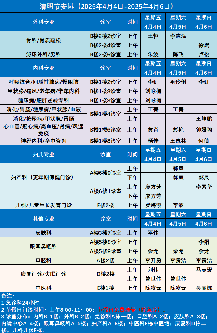 清明節(jié)放假通知(4.4-4.6)門診專科醫(yī)生坐診表(節(jié)假日門診免掛號費)